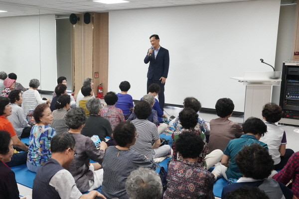 삼선실버복지센터 오리엔테이션에서 이승로 성북구청장이 참가 어르신들에게 인사말을 전하고 있다.