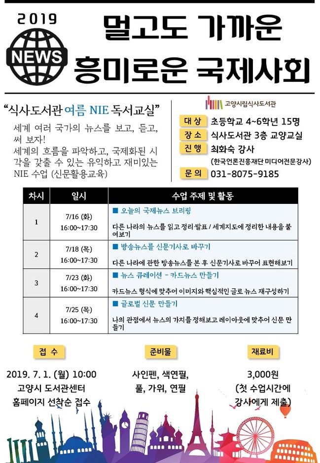 고양시 식사도서관은 초등학교 4~6학년을 대상으로 오는 16일부터 25일까지 매주 화요일과 목요일에 NIE독서교실 ‘멀고도 가까운 흥미로운 국제사회’를 운영한다.