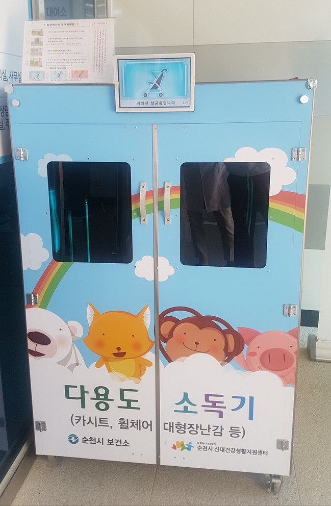 순천시 신대건강생활지원센터에서는 카시트, 유모차, 대형장난감, 유아 완구류 등의 살균 소독이 가능한 다용도소독기를 비치해 시민들의 건강한 생활을 위한 무료 소독 서비스를 제공하고 있다.