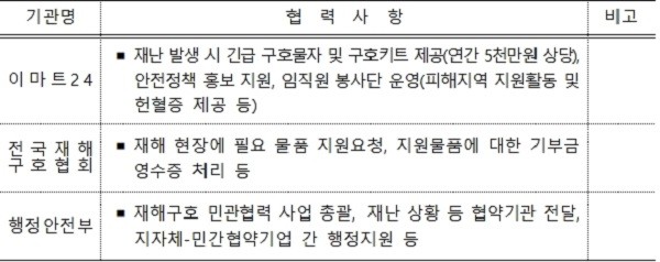 협약서의 주요 내용은 재난현장에 필요한 식료품·생필품 등 구호물품 제공, 이마트24 편의점을 활용한 재난안전정책 홍보 지원, 임직원 봉사단의 피해지역 지원활동 및 헌혈증 제공 등이다.