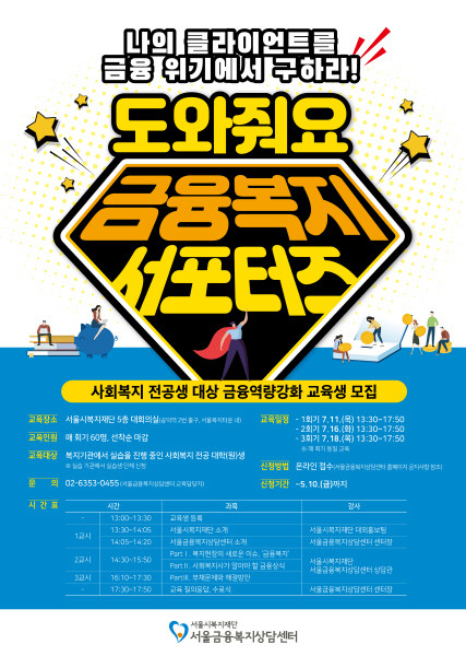서울시복지재단內 서울금융복지상담센터는 11일부터 3회에 걸쳐 ‘나의 클라이언트를 금융위기에서 구하라’를 주제로 복지관 하계 실습생에게 금융역량 강화를 골자로 한 금융복지 교육을 진행한다고 밝혔다.