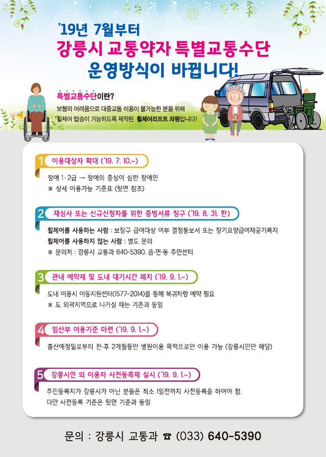 현재 강릉시가 운영 중인 특별교통수단은 총 15대이며, 이번 장애등급제 개편으로 법정 운행 대수가 기존 “1급, 2급 장애인 200명당 1대”에서 “중증 장애인 150명당 1대”로 축소 조정됨에 따라 차량 추가확보가 필요할 것으로 예상된다.