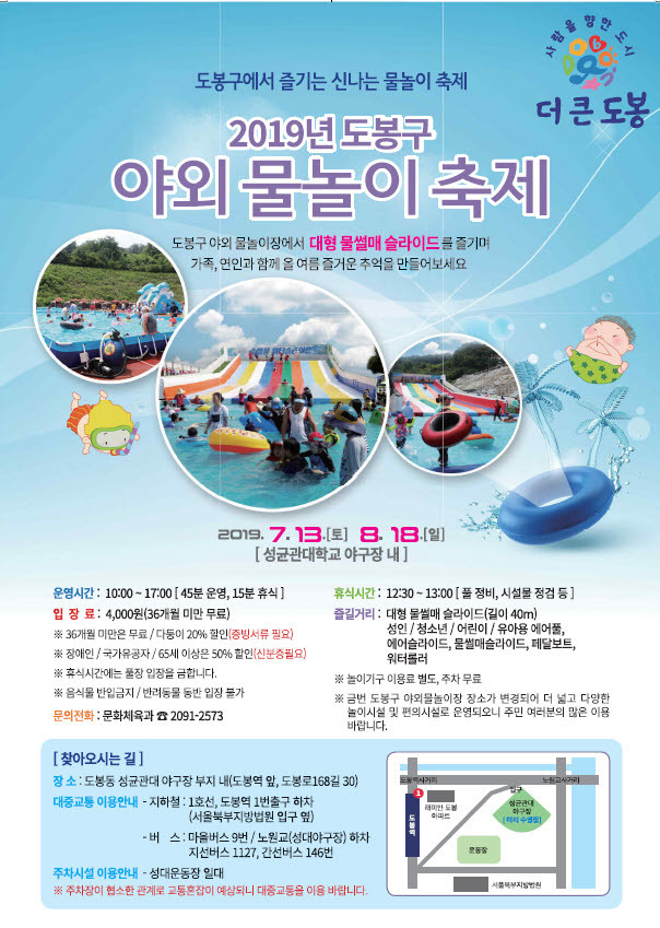 올해 구는 '야외물놀이장‘을 도봉동 성균관대 야구장으로 이전해 더 넓고 다양한 놀이시설을 마련다. 위치 또한 1호선 도봉역 근처로 더 많은 주민들이 편리하게 이용할 수 있도록 했다.