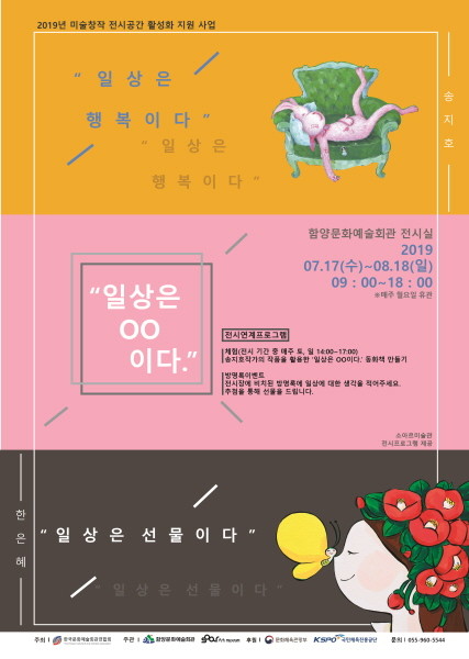 경남 함양군은 오는 17일부터 8월 18일까지 함양문화예술회관 2층 전시실에서 2019년 미술창작 전시공간 활성화 지원 사업으로‘일상은 00이다’展을 진행한다.