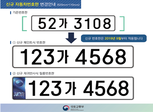 번호판의 앞 숫자가 3자리로 바뀌면서 2.1억 개의 번호판 용량을 확보하게 됐다. 신규 번호판은 기존 흰색 번호판에 앞 숫자만 추가된 현행 페인트식 번호판과 앞 숫자가 추가되고 국가상징 및 축약 부호, 위·변조방지 홀로그램 등이 추가된 재귀반사식 필름 번호판 등 총 2가지 방식으로 발급된다.