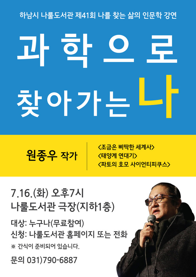 하남시 나룰도서관은 오는 16일 오후 7시 도서관극장에서‘과학으로 찾아가는 나’라는 주제로 제41회 나를 찾는 삶의 인문학 강연을 개최한다.