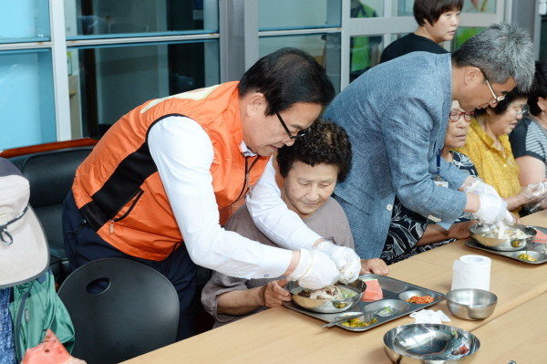 초복특식 후원행사에서 한정우 창녕군수가 창녕군장애인종합복지관 이용자에게 삼계탕을 대접하고 있다.