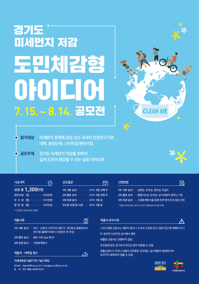 경기도와 차세대융합기술원은 ‘경기도 미세먼지 저감 도민체감형 아이디어 공모전’에 참가할 국내외 전문연구기관 및 대학, 환경단체, 기업, 개인 등을 다음달 14일까지 공개모집한다고 15일 밝혔다.