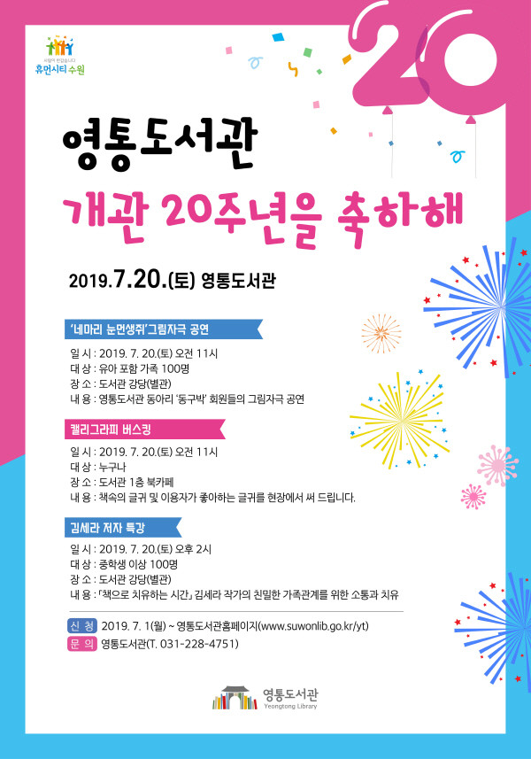 수원시 영통도서관이 개관 20주년을 기념해 오는 20일 오전 11시부터 기념행사를 연다.