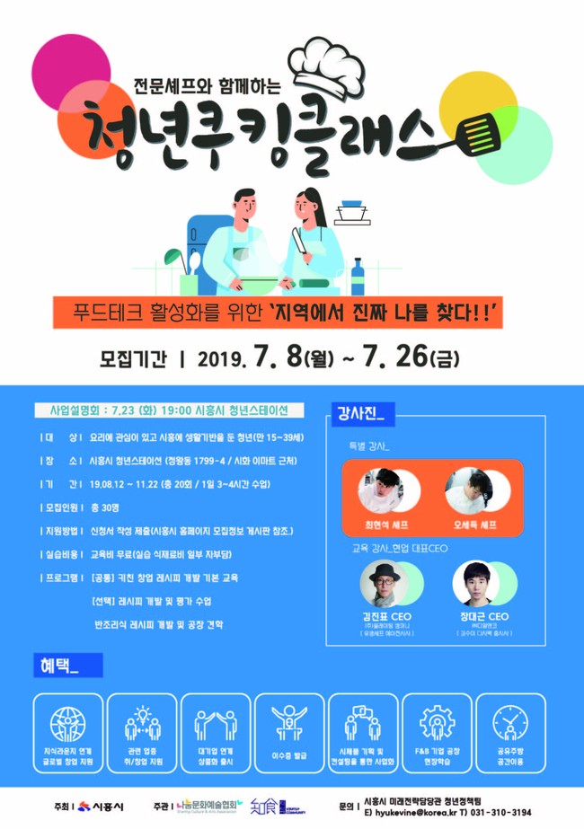 시흥시는 시흥 청년들의 실업 문제 해결책 마련의 일환으로나눔문화예술협회와 함께 ‘전문 셰프와 함께하는 청년 쿠킹 클래스’를 운영한다.