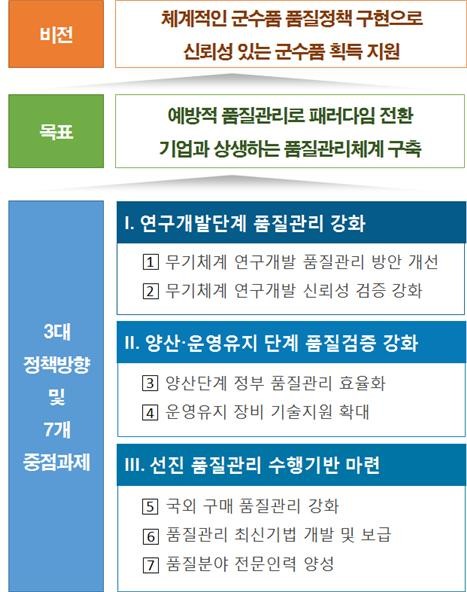 따라서, 방위사업청은 이러한 군수품 품질 문제 해소, 정부 품질보증기관의 전문성 강화, 군수품의 전 순기 품질 신뢰성 향상 방안 마련을 위해 ’군수품 품질관리 기본계획‘ 수립을 추진했다.