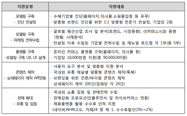 지원대상은 부산 소재 패션브랜드 사업장을 보유한 이커머스 스타트업이다. 5개 기업을 선정하며, 선정된 기업은 온라인 쇼핑몰 매출 증대를 위한 브랜드 컨설팅 및 매뉴얼 구축, 국내외 이커머스 시장 진출을 위한 모델링 구축 및 콘텐츠 제작, 온·오프라인 유통망 구축 및 입점 등의 지원을 받을 수 있다.