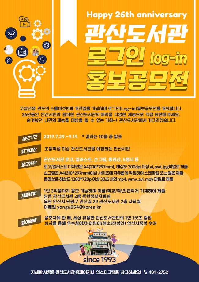 안산시 관산도서관은 개관 26주년을 기념해 시민들의 스마트한 재능을 뽐낼 수 있는 ‘로그인log-in 홍보공모전’을 개최한다고 16일 밝혔다.