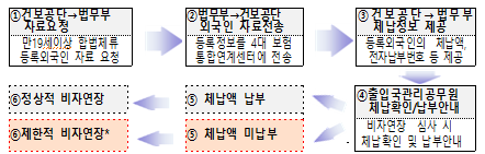 비자연장 제한제도 시행에 필요한 건강보험 체납정보를 법무부와 국민건강보험공단이 공유할 수 있도록‘출입국관리법’이 개정되었으며, 본격적인 제도시행에 앞서 시범사업이 7월 2일부터 수원출입국·외국인청에서 실시 중이다.