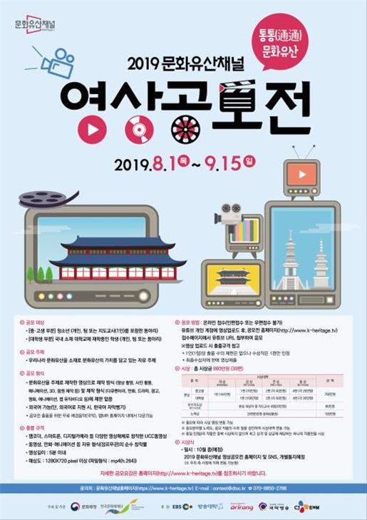 문화재청이 지원하고 한국문화재재단이 운영하는 ‘문화유산채널’에서 중고생과 대학생을 대상으로 ‘2019 문화유산채널 영상공모전’을 오는 8월 1일부터 9월 15일까지 개최한다.