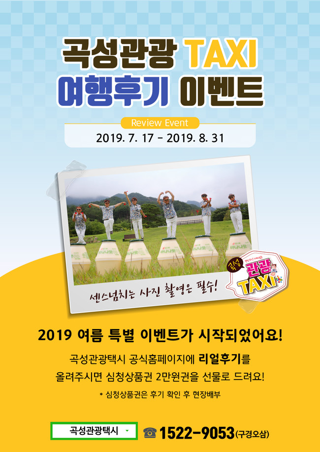 곡성군은 오는 17일부터 8월 31일까지 휴가철을 맞아 곡성관광택시 후기 이벤트를 진행한다.