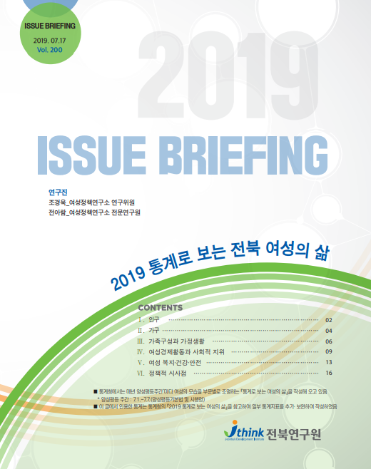 전북연구원은 통계지표를 통해 전북 여성의 변화 및 주요 특징을 쉽게 알아볼 수 있도록 2019 통계로 보는 전북여성의 삶 이슈브리핑을 발간하였다. 본 이슈브리핑은 통계청이 매년 양성평등 주간마다 발표하는 여성관련 통계지표를 중심으로 일부 통계지표를 추가·보완하여 작성하였다.